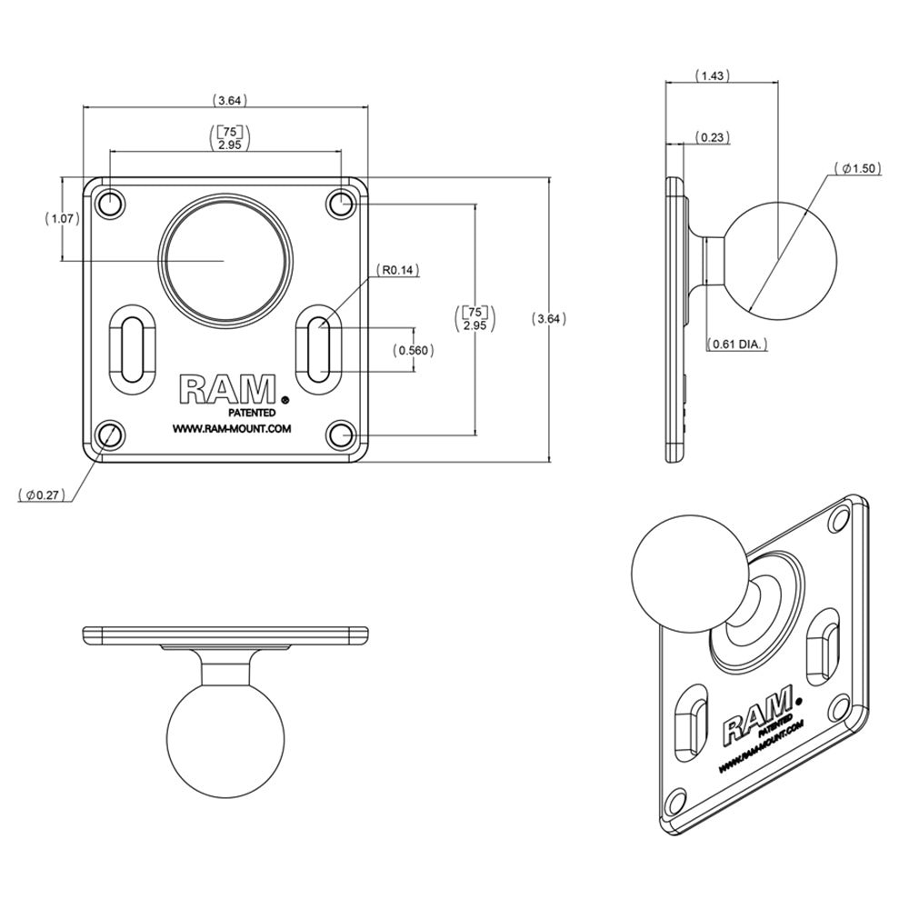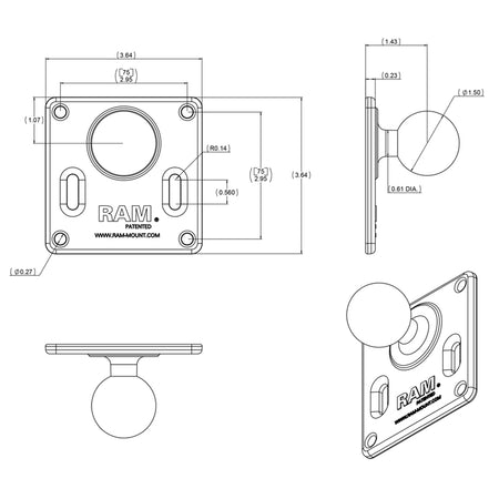 RAM 75mm X 75mm VESA 3.625" Plate with 1.5" Diameter Ball