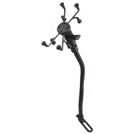 Consists of the universal spring loaded X-Grip II holder and RAM POD I universal No-Drill vehicle mount. The base of the mount clamps to your seat rail without any drilling necessary. Connected to the base is a 18" rigid flexible rod that can be bent to position your device to it's optimum viewing location. The RAM POD I will hold everything you need safely and securely.