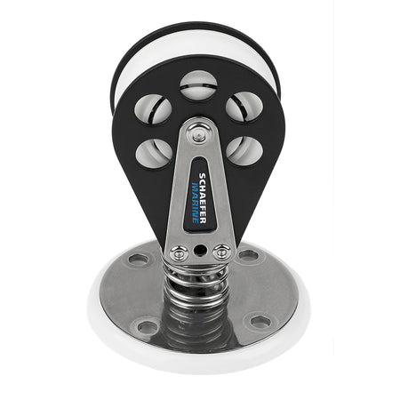 Single stand up ball bearing block. Stand up spring keeps block upright when not in use. Stainless steel base spreads load out and may be used with 97-49 backing plate. (sold separately) Delrin(tm) ball bearing sheave provides a low-friction high strength sheave. Sheave Dia. 2-2/8" (60 mm), Max Line 1/2" (13 mm), Dia. includes urethane base 3-3/8" (86 mm), Height 4-25/32" (120 mm), H2 2-15/32" (63 mm), Fastener Size (4),1/4" RH (6 mm), C/C 1-11/16" (43 mm), SWL 1700 lbs (771kg), Weight Alum. 11.7 oz (332 g).