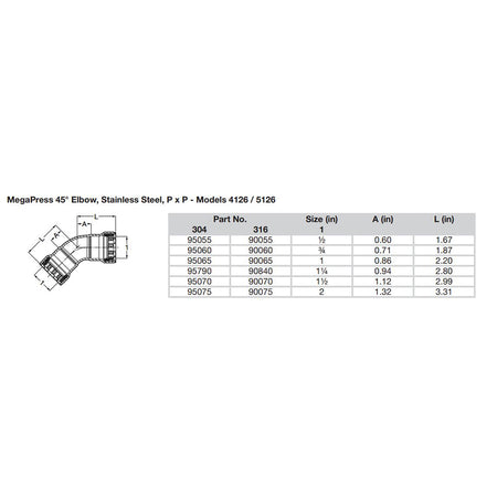 MegaPress 1-1/2" 45° Stainless Steel 304 Elbow - Double Press Connection - Smart Connect Technology