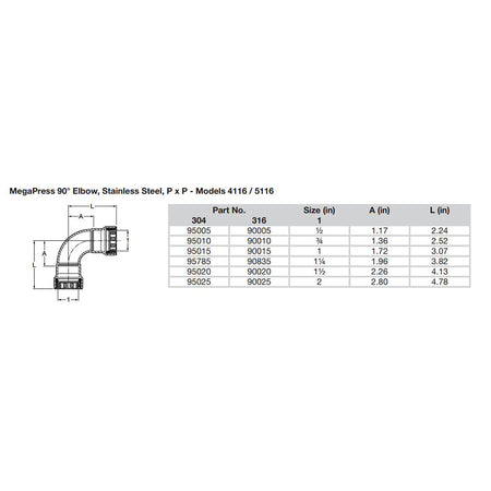 MegaPress 1-1/2" 90° Stainless 304 Elbow - Double Press Connection - Smart Connect Technology