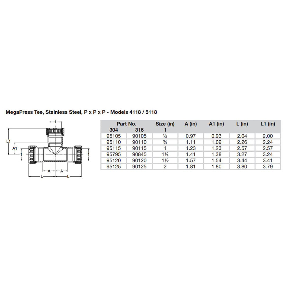 MegaPress 1-1/2" Stainless Steel 304 Tee - Triple Press Connection - Smart Connect Technology