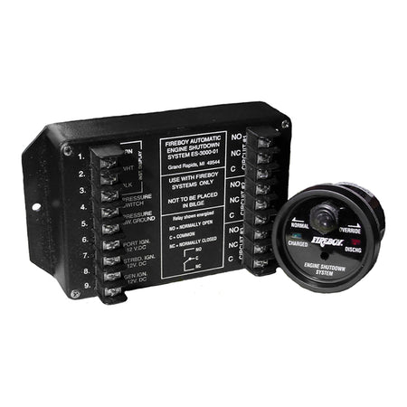 Consisting of a Shutdown Control Module and Helm Display Unit with an Override Button the Fireboy Engine Shutdown System is an effective means to automatically shut down engines, generators, and blower systems in the event of a fire.